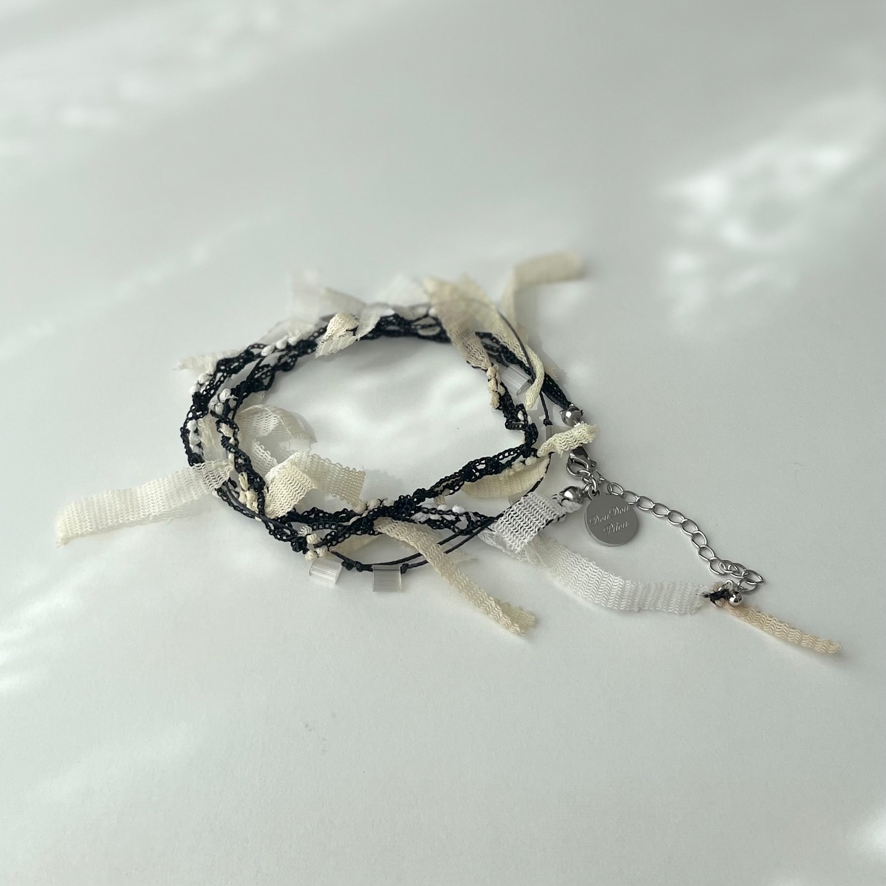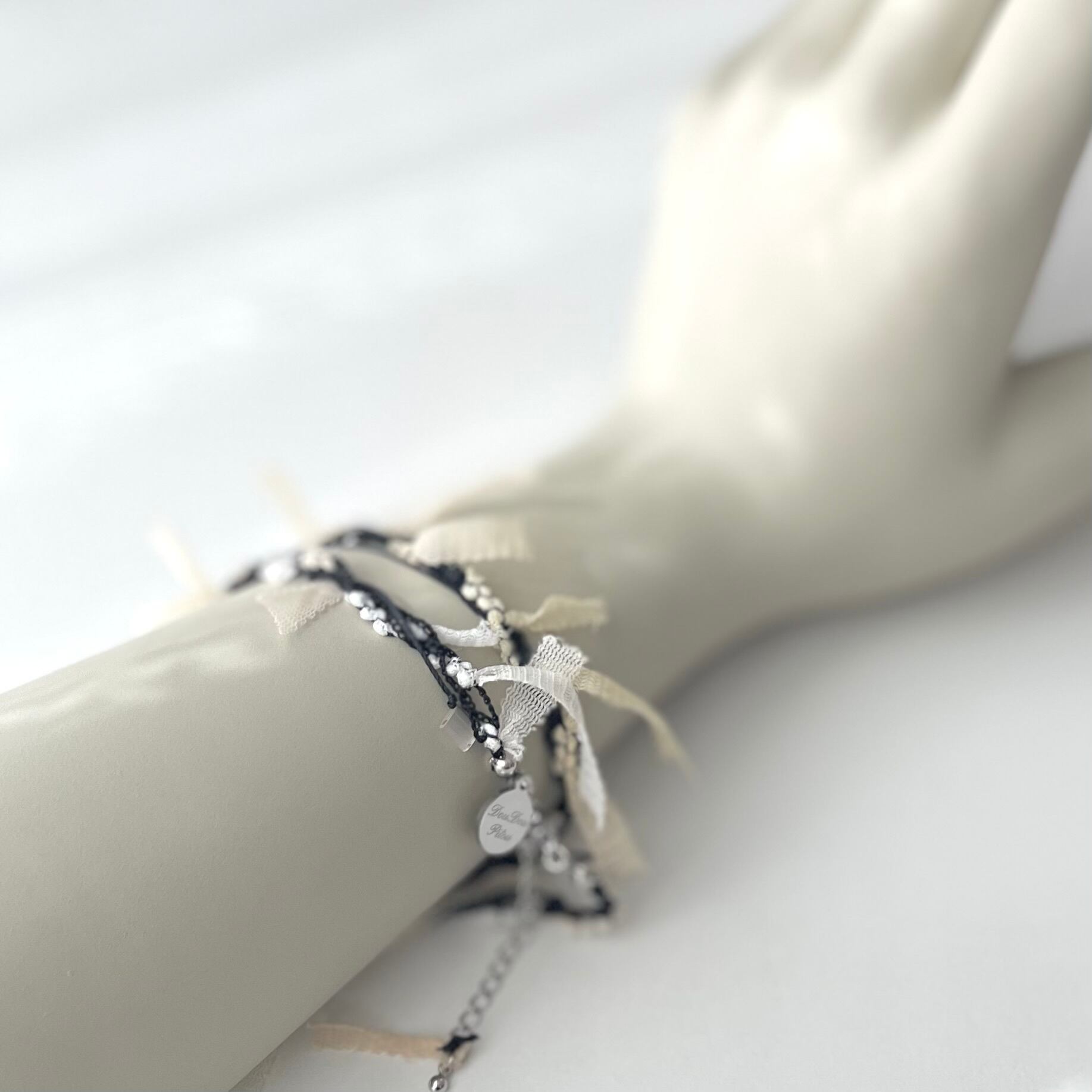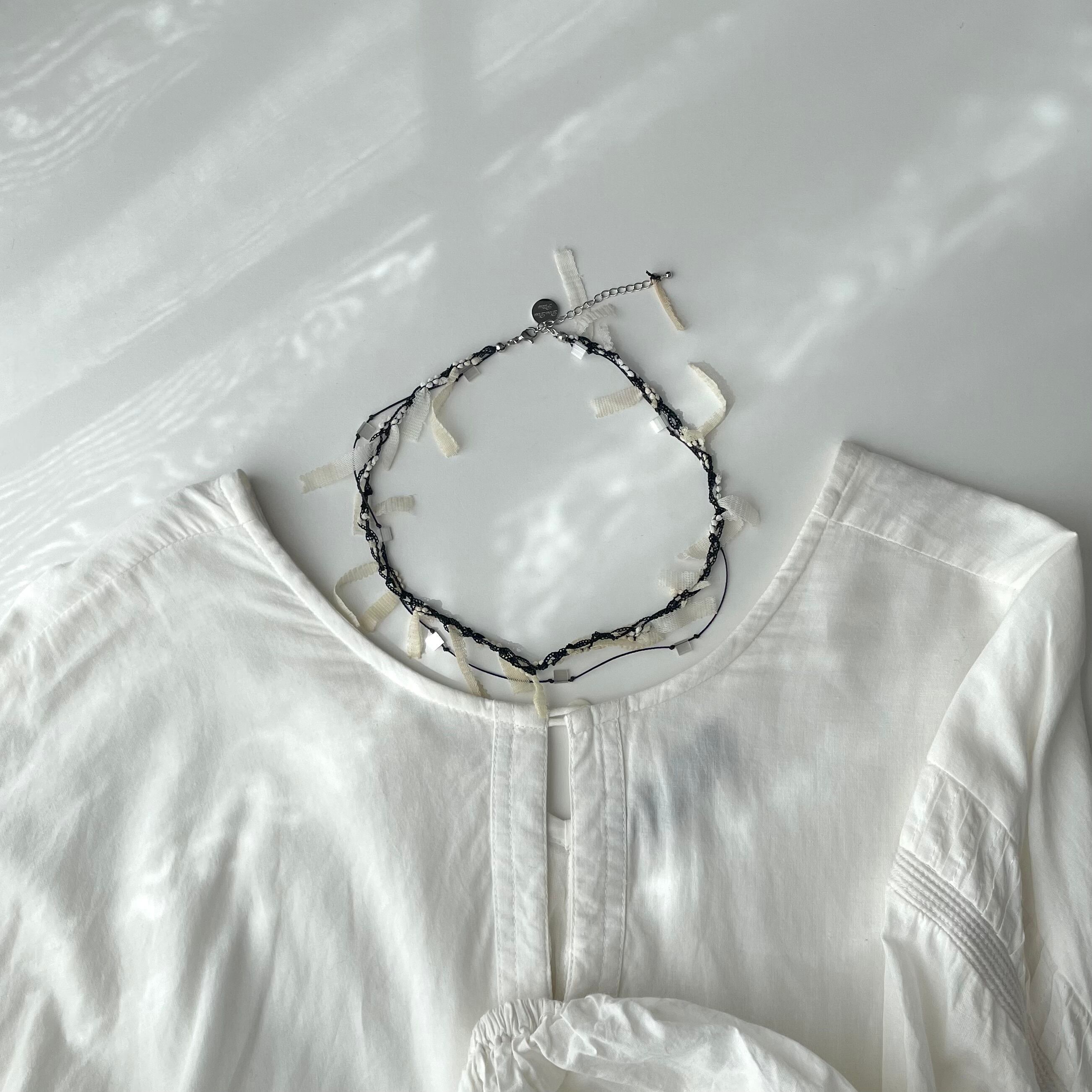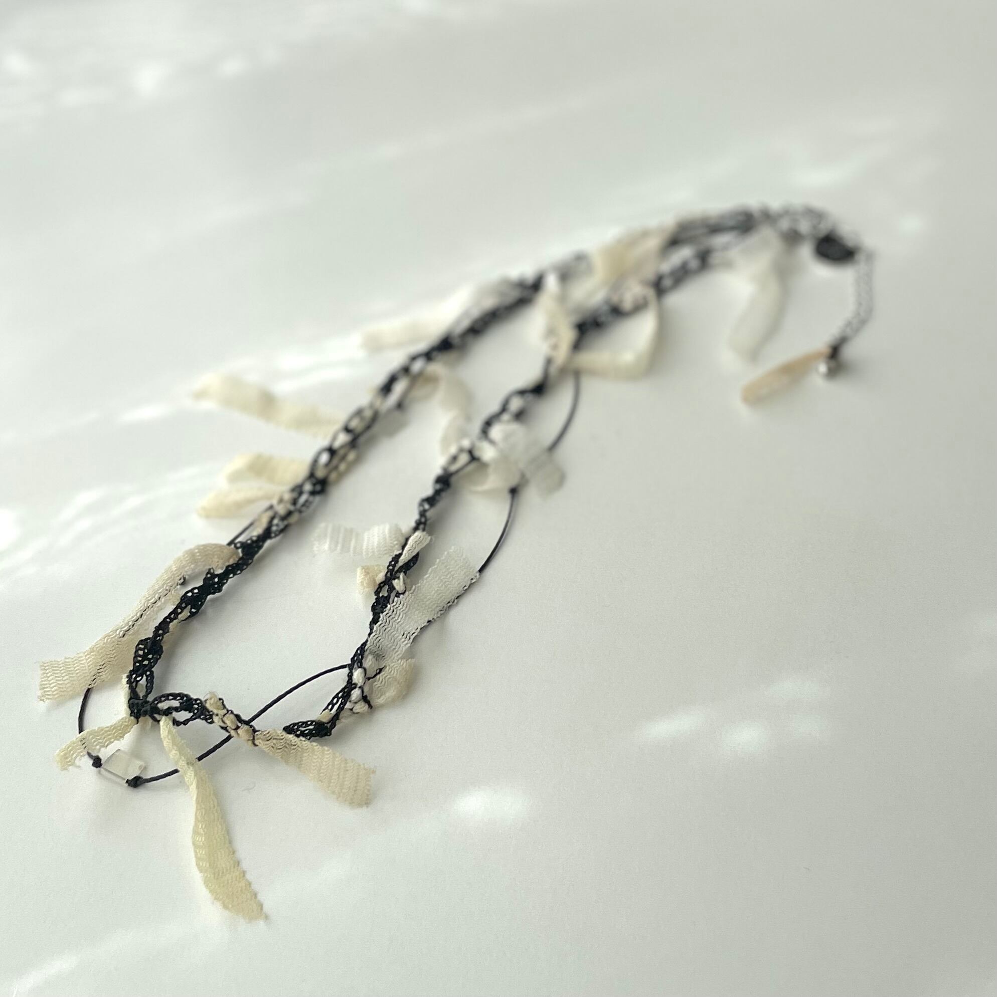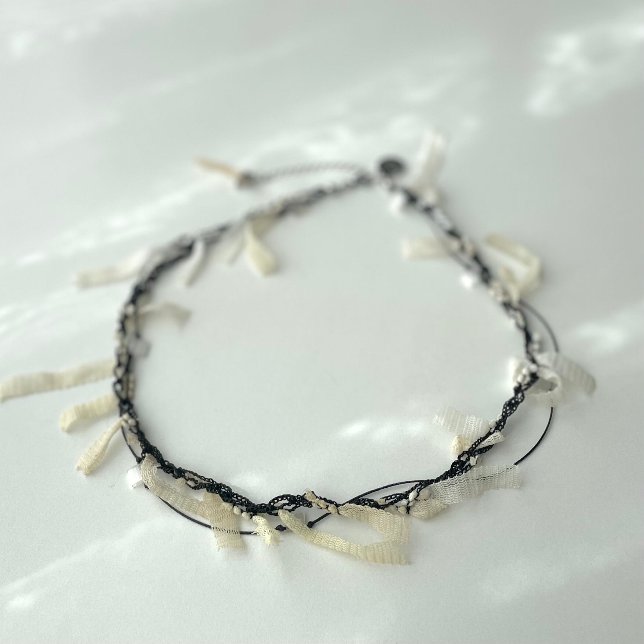 黒の糸に、むら染めされた布がふんわりと編み込まれた、表情豊かなハンドメイドアクセサリーです。ところどころに散りばめたガラスビーズが、光を受けてさりげなくきらめき、装いに静かな華やぎを添えます。